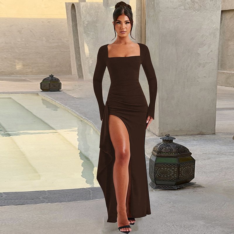 Crafted with a sophisticated silhouette, this long sleeve dress features a square neckline that gracefully accentuates the collarbone. Made from quality polyester, its slim fit offers a refined drape that flatters the figure, making it an ideal choice for formal occasions in the autumn months.