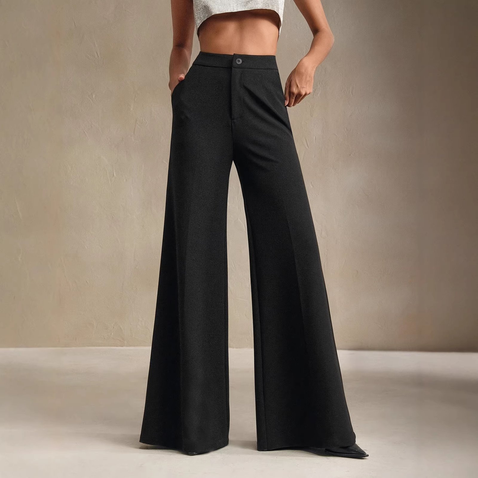 Wide-leg trousers crafted from high-grade polyester feature a high rise and loose silhouette, offering comfort and refinement for both casual and professional occasions.