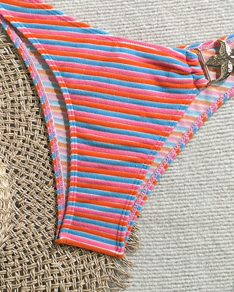 This two-piece swimsuit features a fitted silhouette crafted from lightweight polyester, designed for leisurely moments by the pool or beach. The striped pattern adds a subtle dimension while maintaining a classic look that effortlessly integrates into your summer wardrobe.