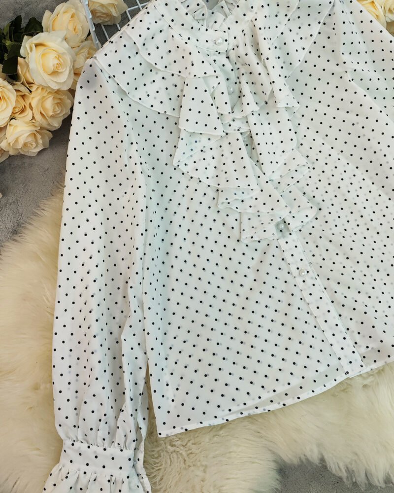 The relaxed silhouette of this blouse, made from soft polyester, offers a graceful, flowing fit enhanced by a V-neckline and long sleeves. Its subtle polka dot pattern transitions seamlessly from casual gatherings to more formal affairs, making it suitable for a range of spring and fall occasions.