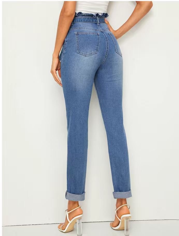 Confeccionados en denim de algodón de alta calidad, estos pantalones lucen una silueta refinada en un sereno azul cielo. Su corte de tiro alto y pernera recta se adaptan a la perfección tanto para salidas informales como para un ambiente relajado de oficina, convirtiéndolos en una prenda versátil para cualquier armario.