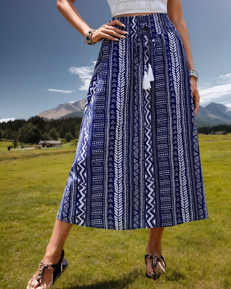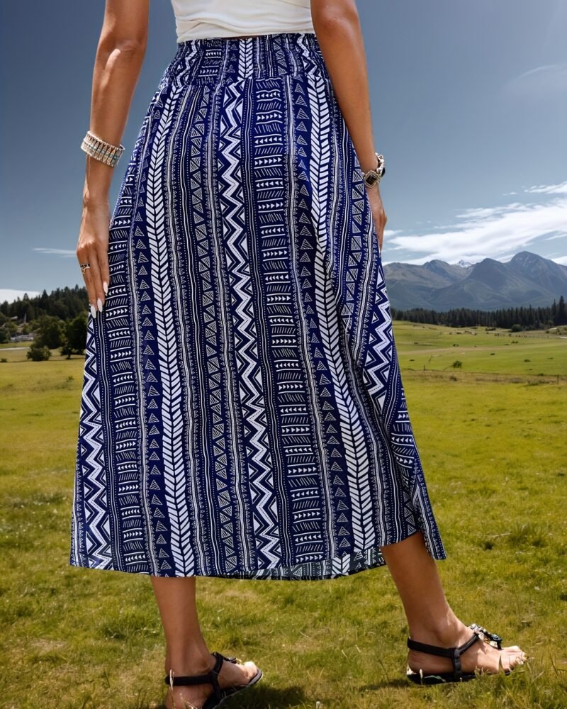 Defined by a high-rise fit and a refined A-line silhouette, this midi skirt embodies effortless elegance, crafted from soft, breathable polyester. The subtle striped and chevron patterns enhance its timeless appeal, making it suitable for warm-weather outings or layered looks during transitional seasons.