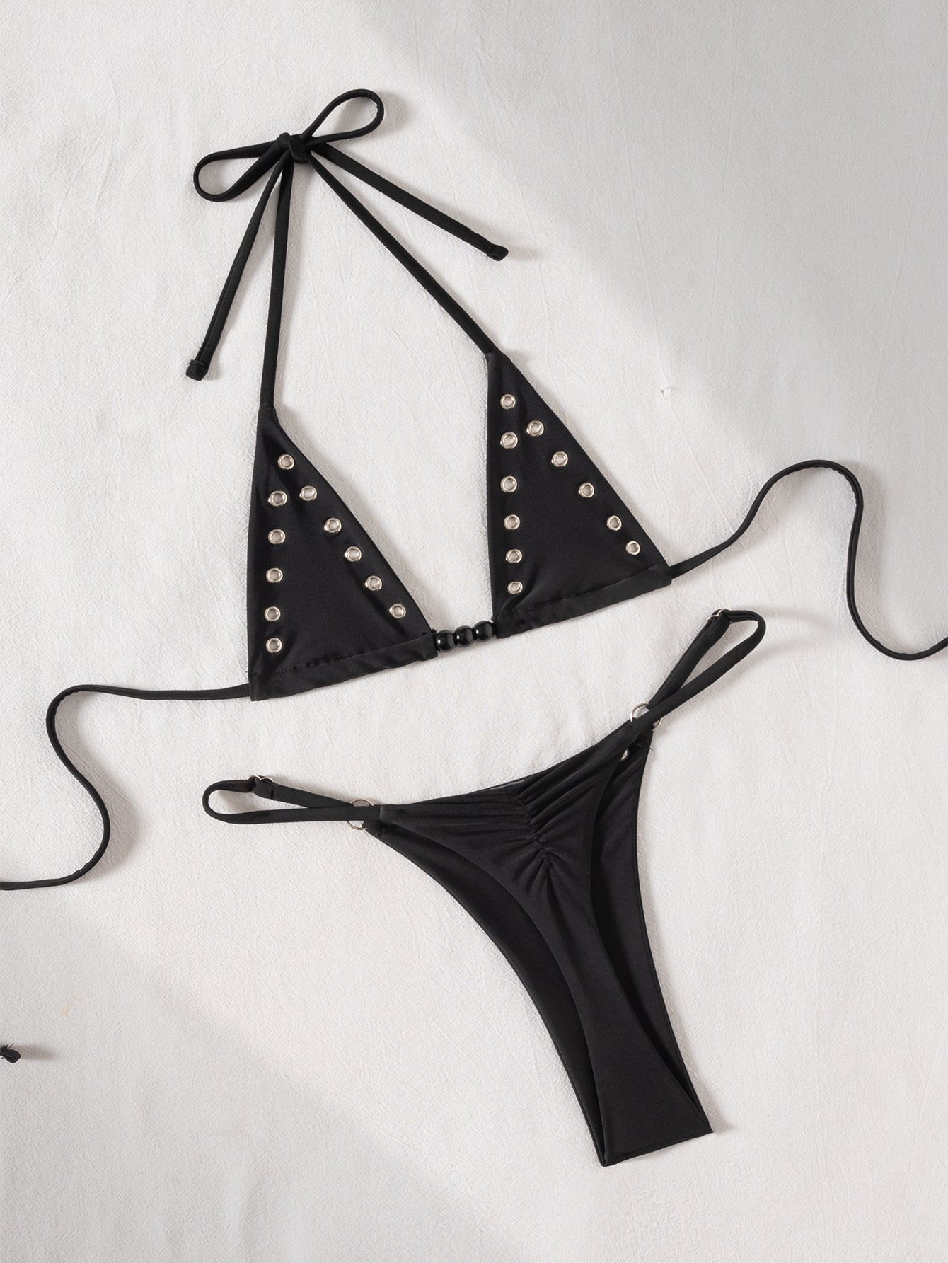 This halter-style bikini showcases a triangle cup design crafted from smooth nylon, ideal for effortless beach days and sun-soaked vacations. The clean lines provide a sleek silhouette, enhancing comfort while allowing for freedom of movement.