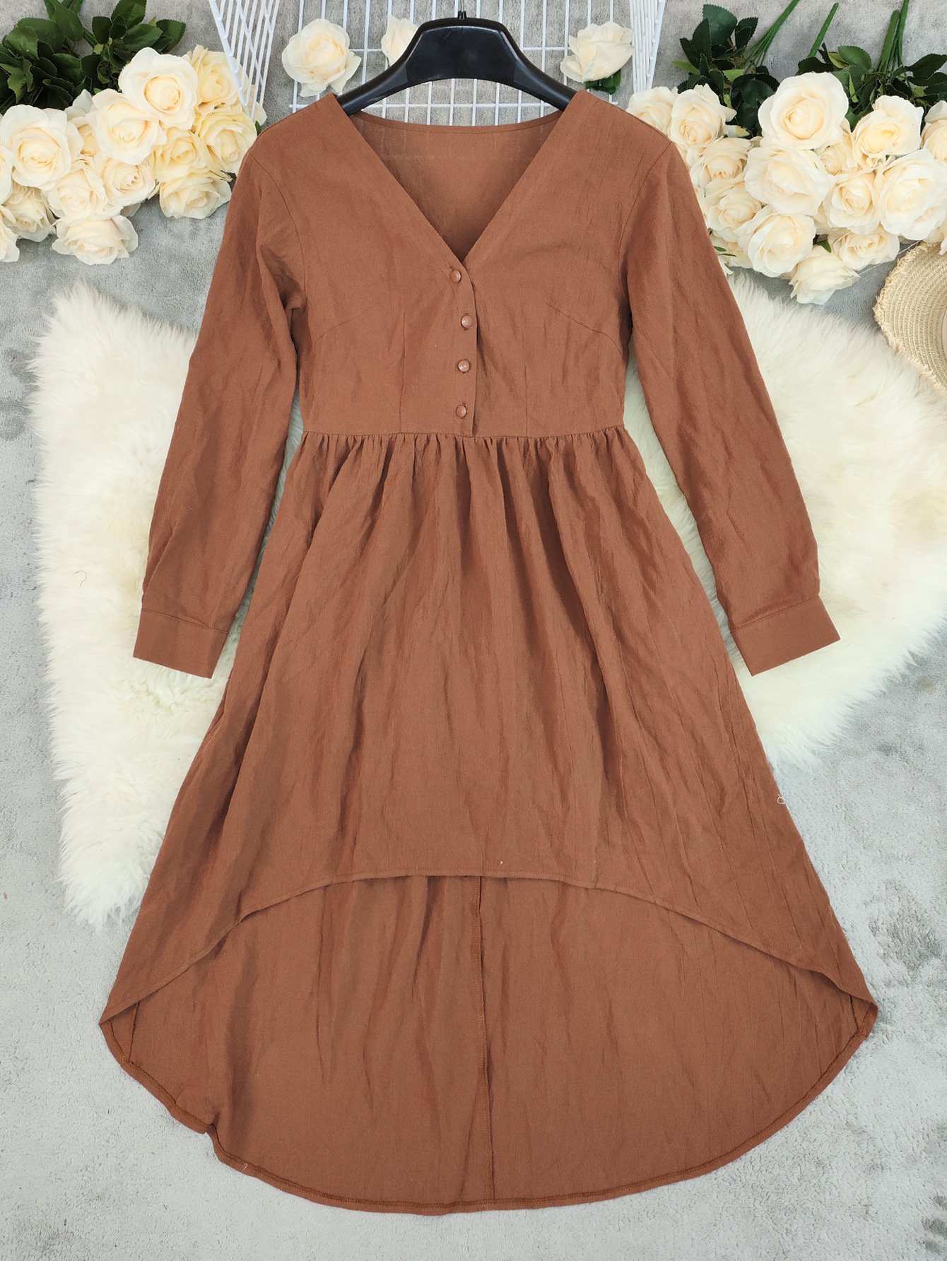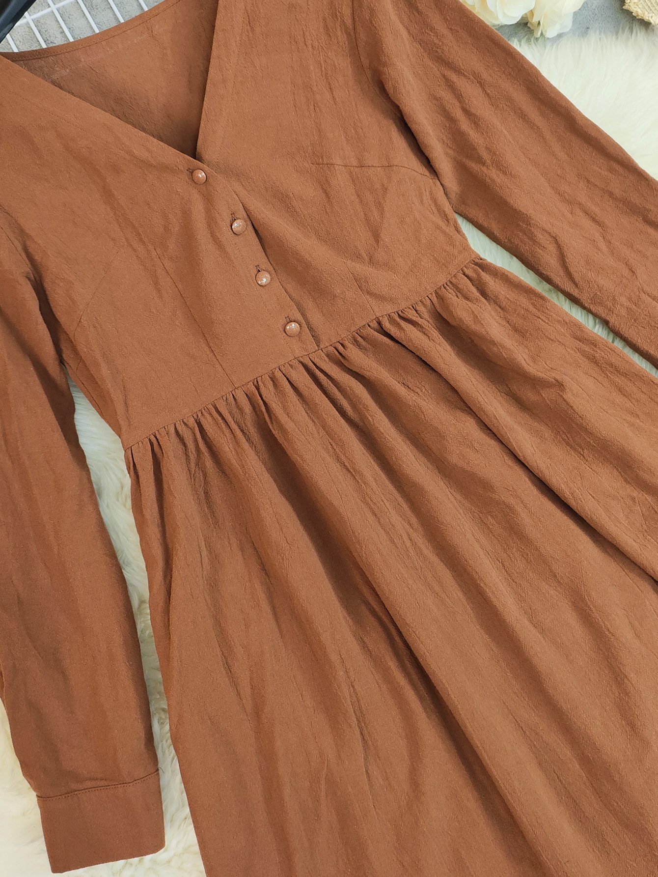 This dress showcases a graceful A-line silhouette, crafted from a comfort-rich polyester blend. With a refined V-neckline and long sleeves, it transitions seamlessly from casual to professional environments, embodying everyday elegance. The subtle ruched detail adds a touch of sophistication, ensuring a flattering fit without sacrificing comfort.