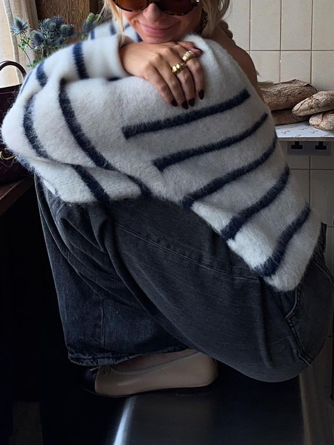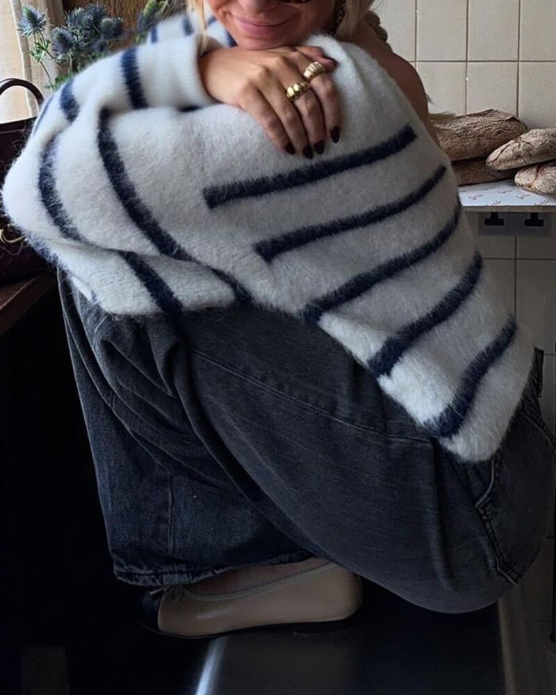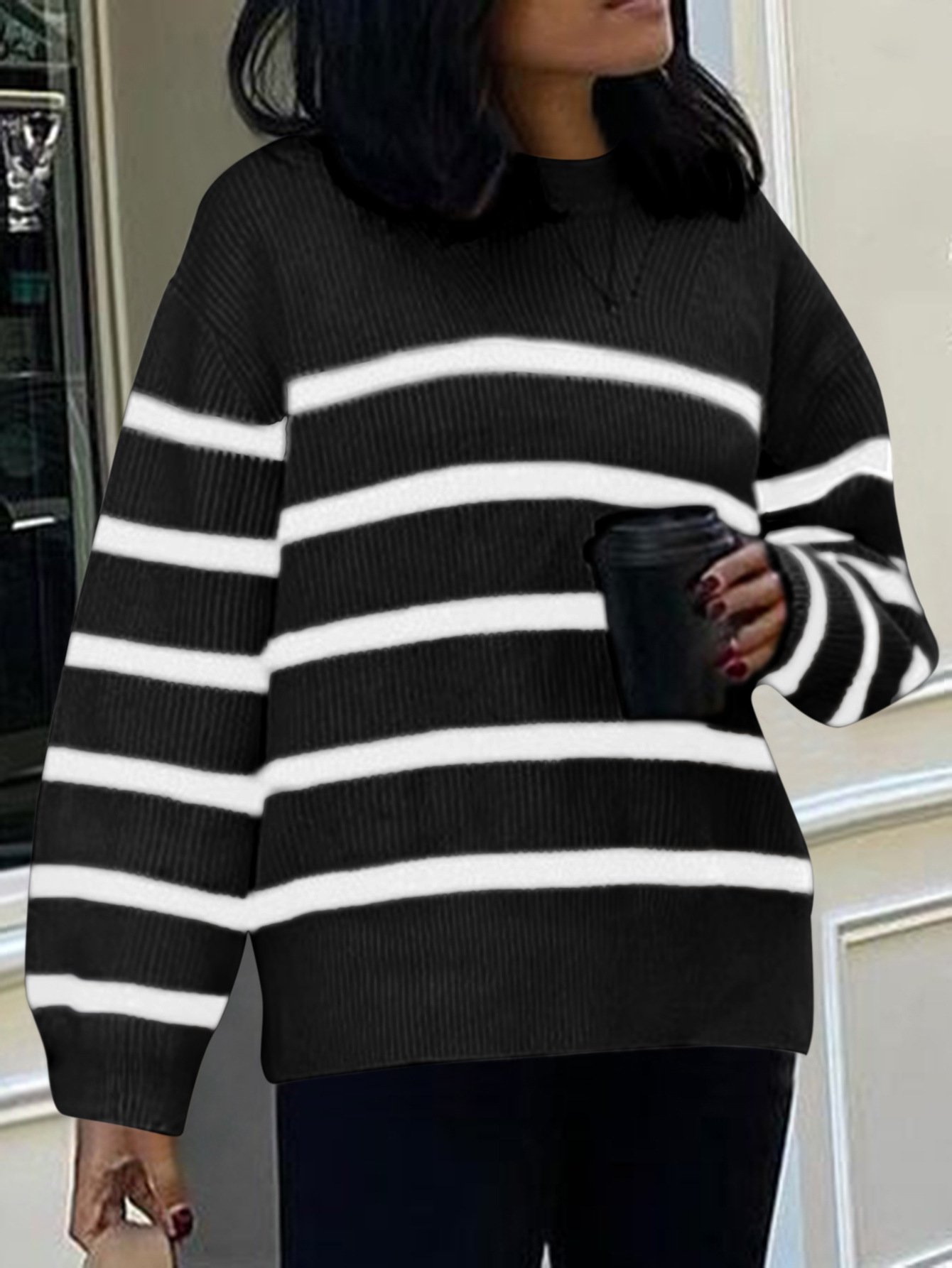 The relaxed silhouette features soft jersey fabric with a timeless striped pattern, ideal for casual settings in both spring and fall. Designed with a crew neckline and long sleeves, this top offers a comfortable fit, seamlessly integrating into a diverse wardrobe.