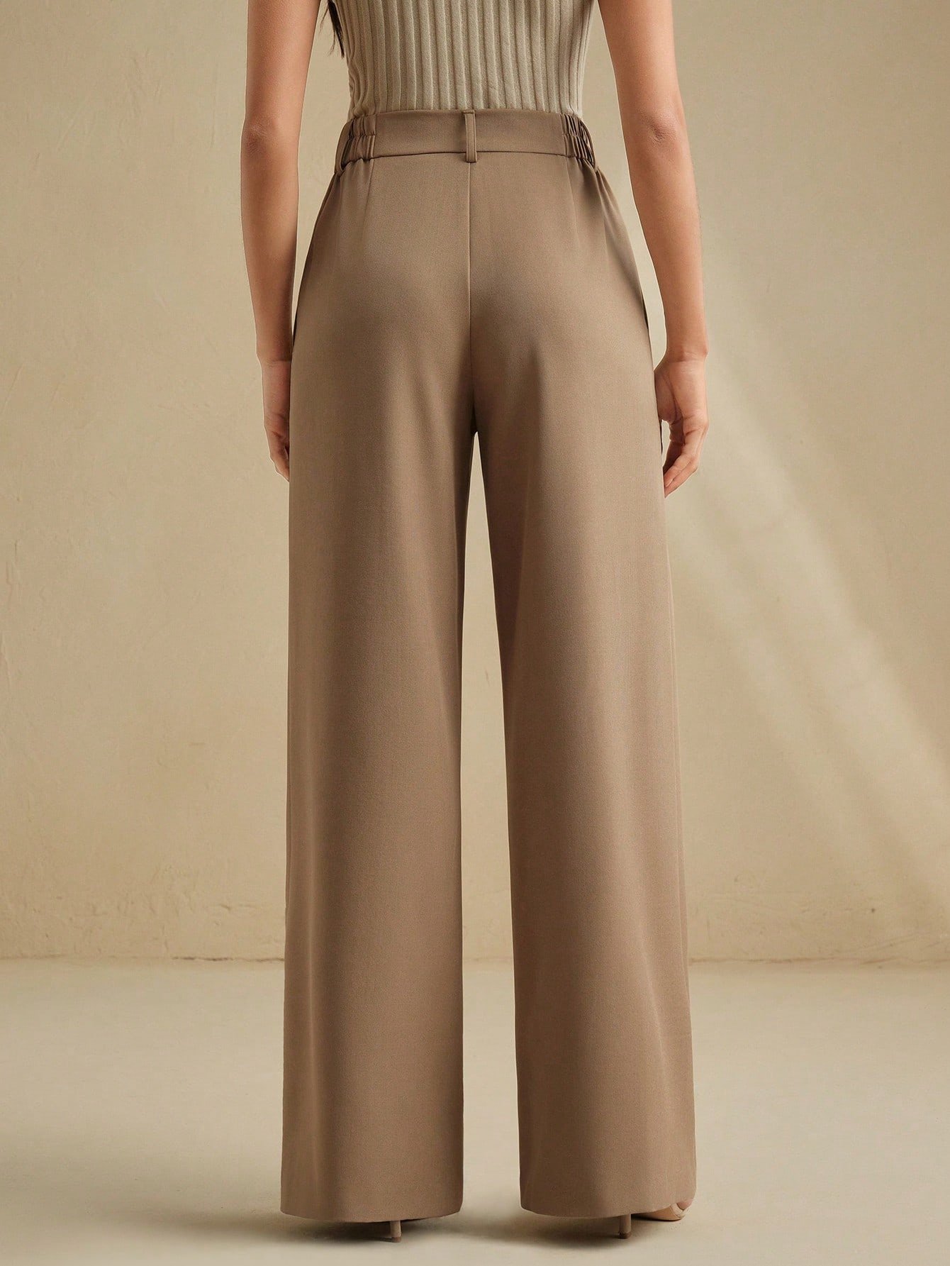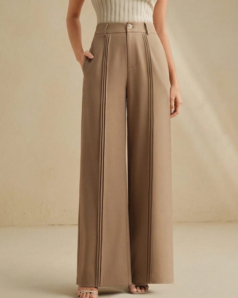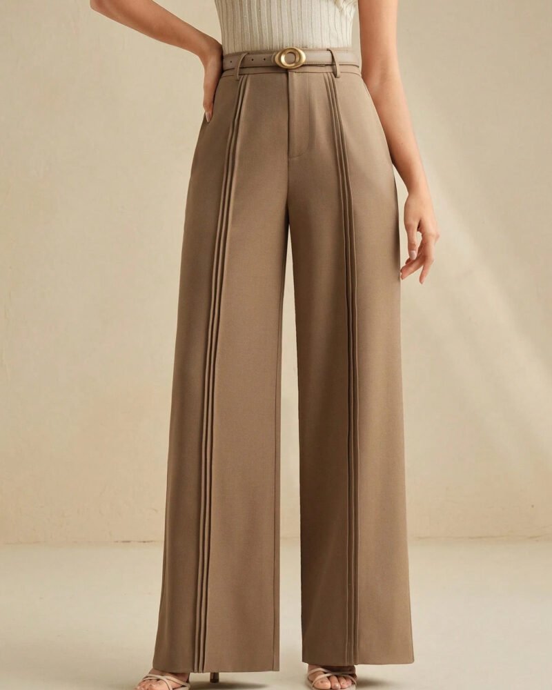 These high-waist wide-leg trousers are expertly crafted from a premium polyester blend, presenting a refined silhouette that seamlessly transitions from office meetings to casual gatherings. The soft fabric drapes elegantly, offering a comfortable yet polished fit.