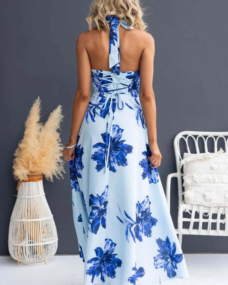 This refined A-line maxi dress features a gracefully structured silhouette, made from lightweight polyester that enhances comfort during warm summer days. The elegant halter neckline beautifully frames the shoulders while floral patterns and tie detailing add sophistication, making it suitable for both casual outings and special occasions.