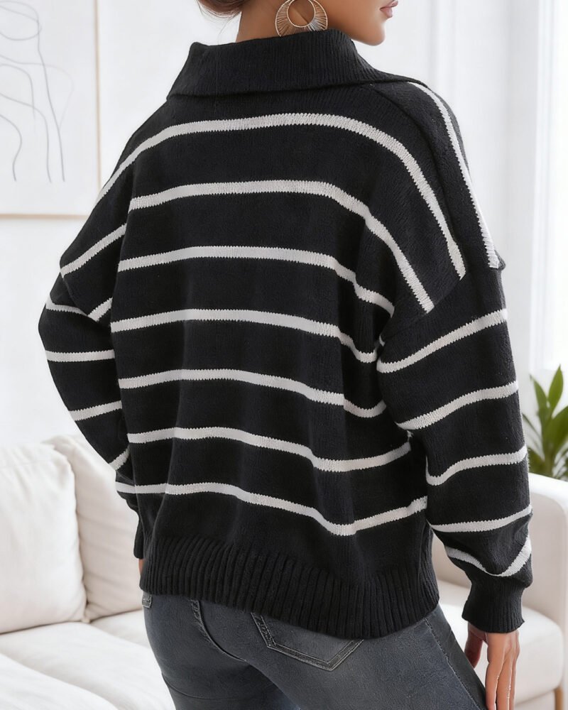This long sleeve polo sweater features a casual silhouette, crafted from soft jersey fabric that drapes fluidly against the body. Its collared neckline and floral stripe patterns lend an understated elegance, making it suitable for relaxed outings or casual office wear during spring and fall.