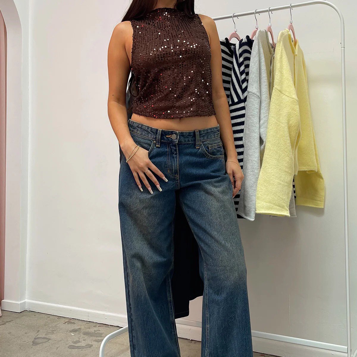 This sequined cropped top offers a refined silhouette, crafted from a lightweight polyester blend that enhances both comfort and style. Designed for versatility, it effortlessly transitions from casual summer gatherings to more festive occasions.