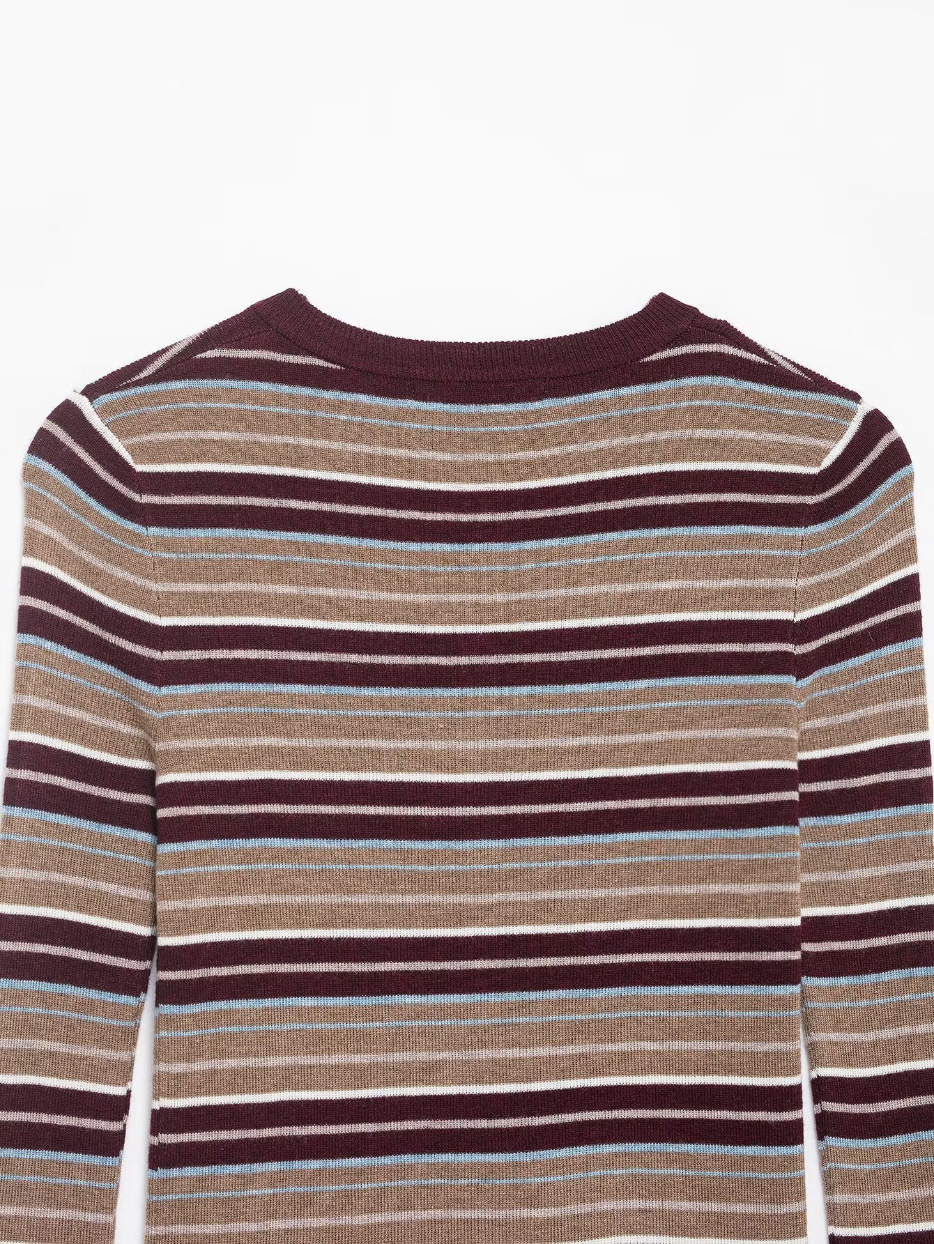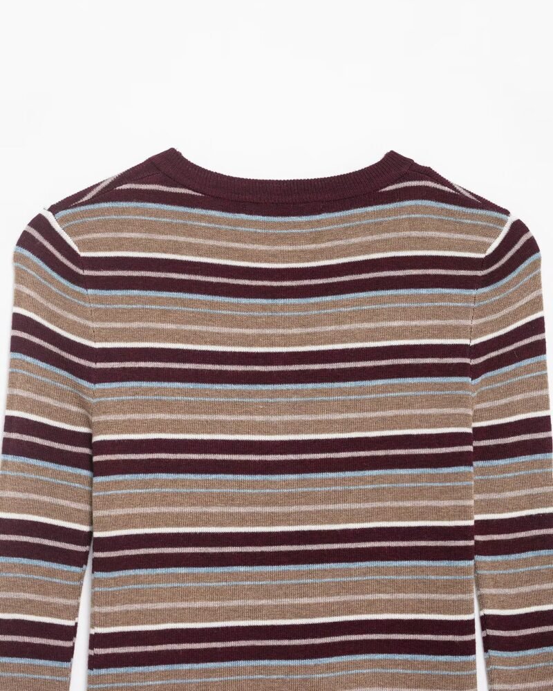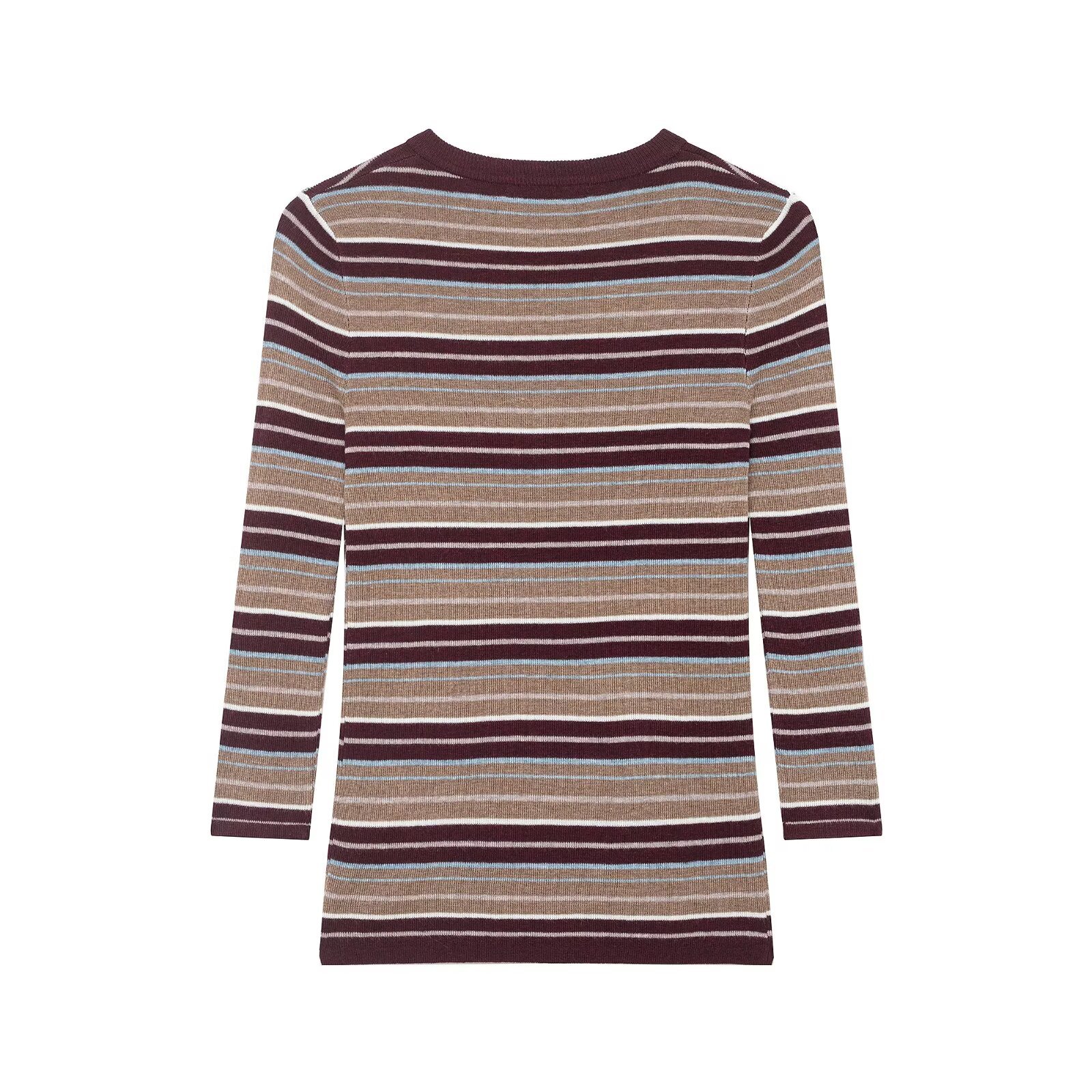 This slim silhouette sweater is expertly crafted from soft jersey fabric, featuring a timeless striped pattern that complements casual looks for spring and fall. Its crew neckline and three-quarter sleeves provide a comfortable layering option, making it suitable for a variety of settings.